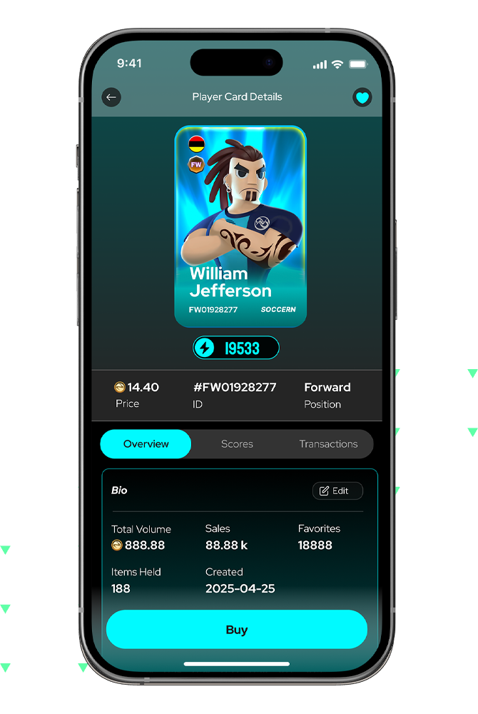 Create personalized Digital Player Cards with integrated real-life performance data. Earn royalties from every trade.